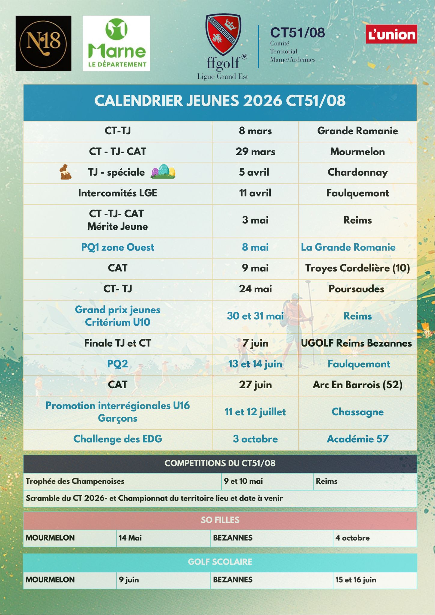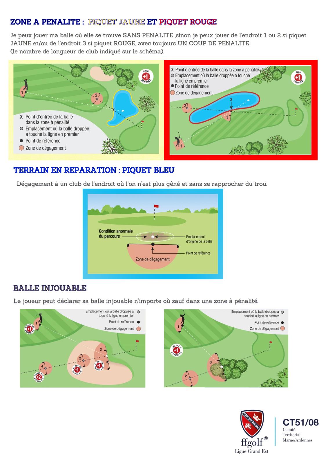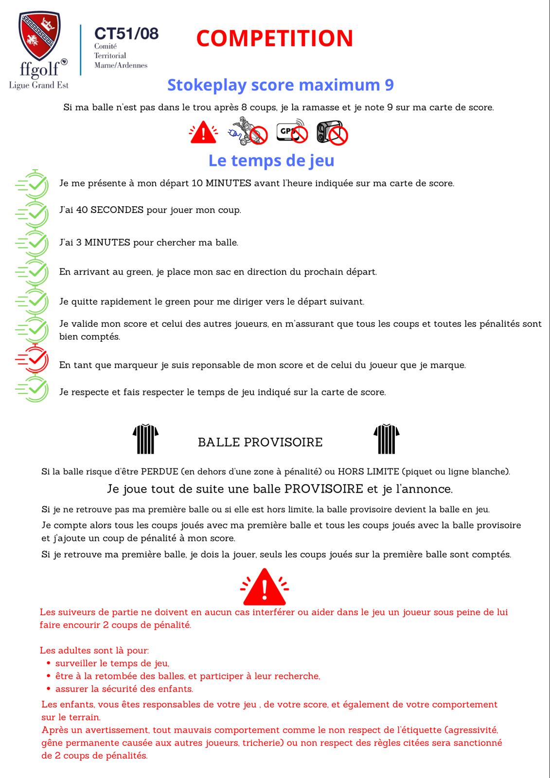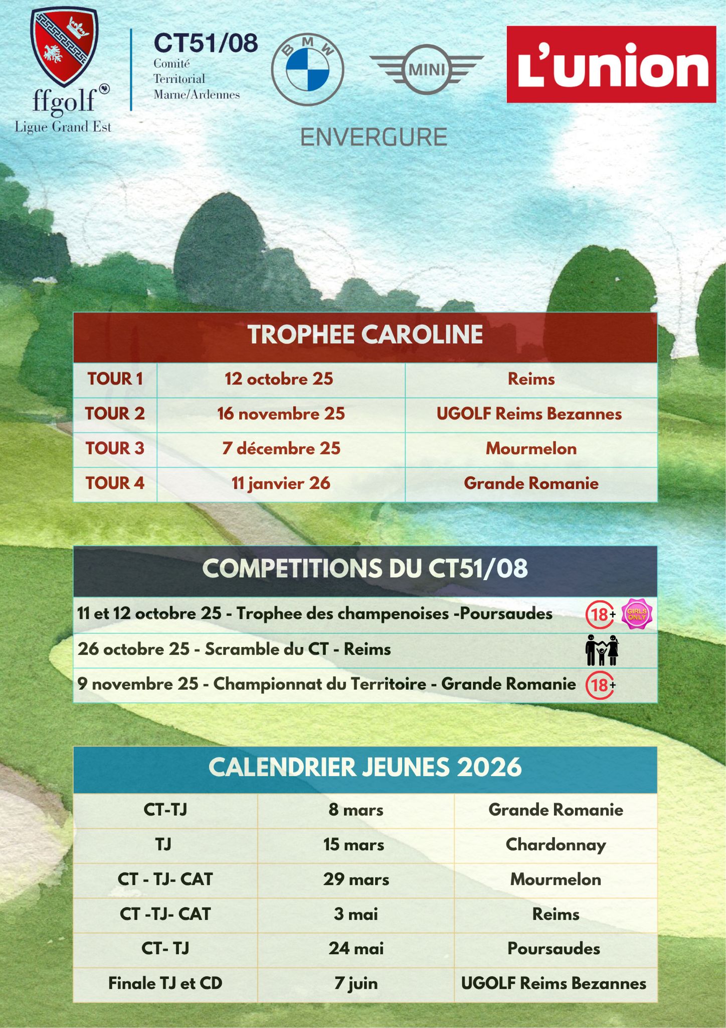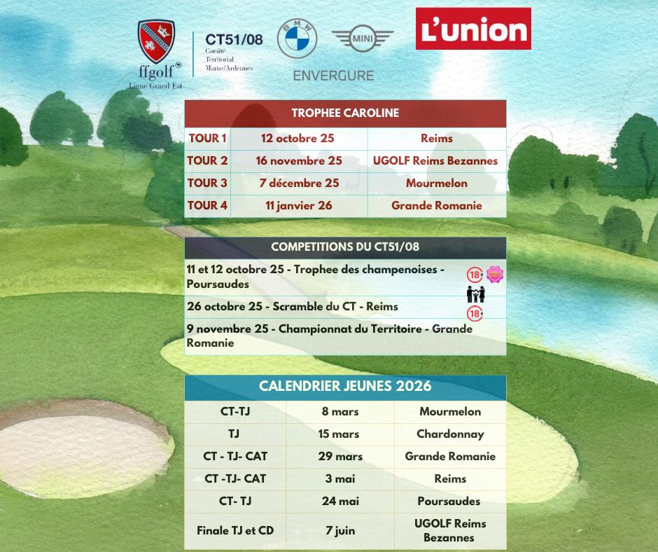 Plusieurs écoles de Golf de la Marne s'affrontent tout au long de l'année dans différentes catégories : Tour Jeunes, Champagne Ardenne Tour et Challenge Départemental 51. Pour rappel, le TOUR JEUNE s’adresse à tous les u8, u10 et u12 débutants, sur les départs orange, 9 coups maximum. Pour les autres catégories, il faut au minimum avoir le drapeau jaune. Vous trouverez les règlement dans les documents ci-dessous. Plus vous êtes nombreux à participer au CD51, et plus de chance nous avons de remporter le challenge !!! |