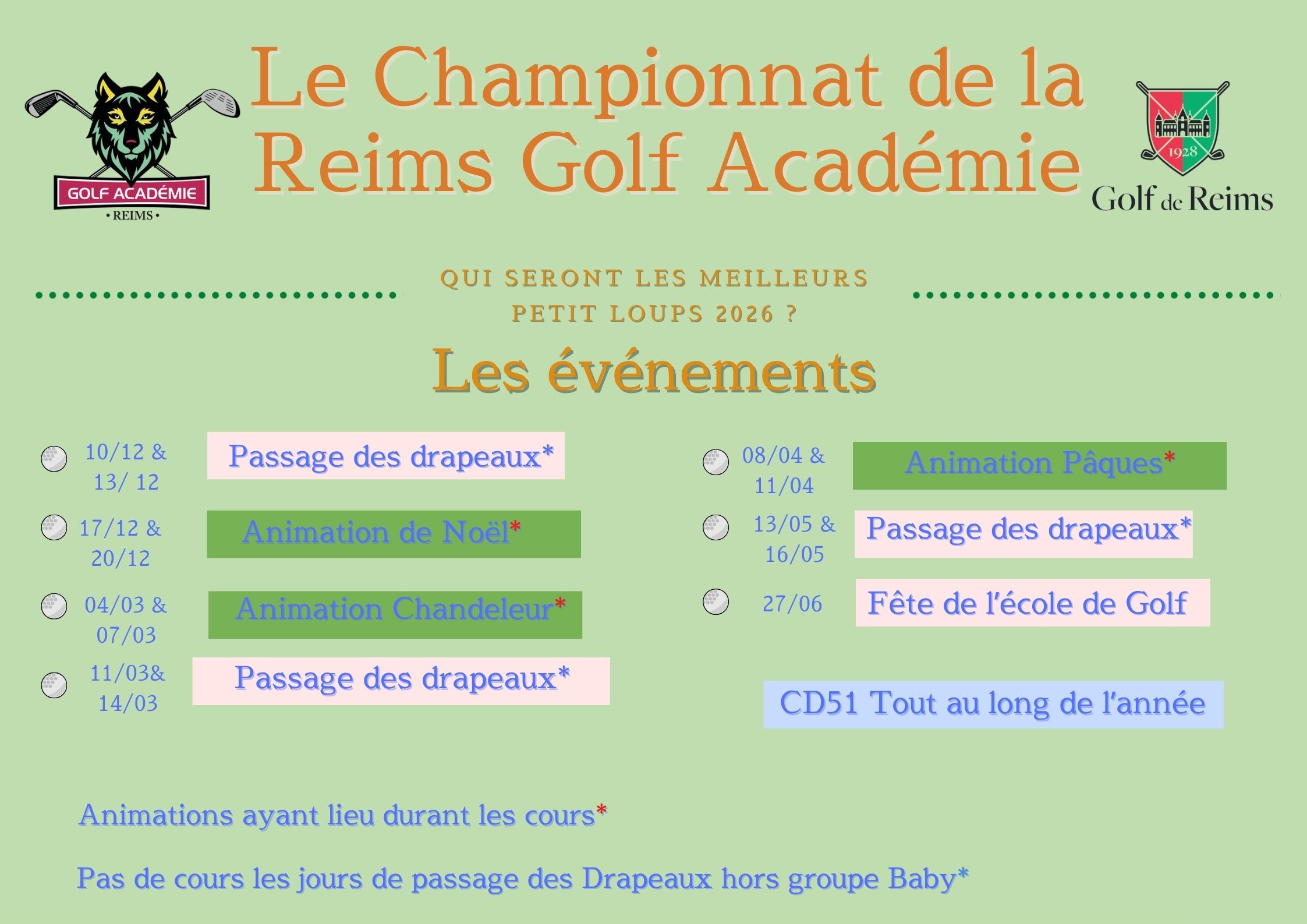 La Reims Golf Académie vous attend le mercredi et le samedi, de Septembre à Juin hors vacances scolaires (Zone B).